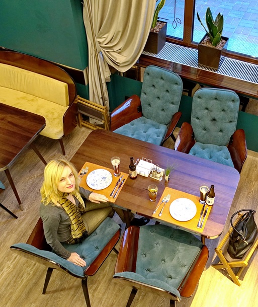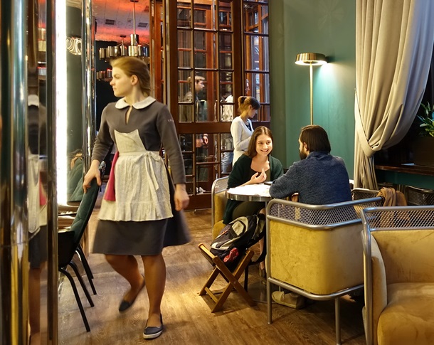 Блестящие деревянные поверхности, столы и кресла на круглых тонких ножках, чешские стенки в библиотеке, хрусталь, дефицитные по советским временам книги, серванты с высокими бокалами для гостей, торшеры, настенные лампы и официантки в передниках - все это создает у вас ощущение, что вы попали в город эпохи “Служебного романа”. Способствует этому и изумительно приготовленная котлета по-киевски, своеобразная визитная карточка заведения. В залах умиротворяюще звучит музыка украинской эстрады семидесятых.
